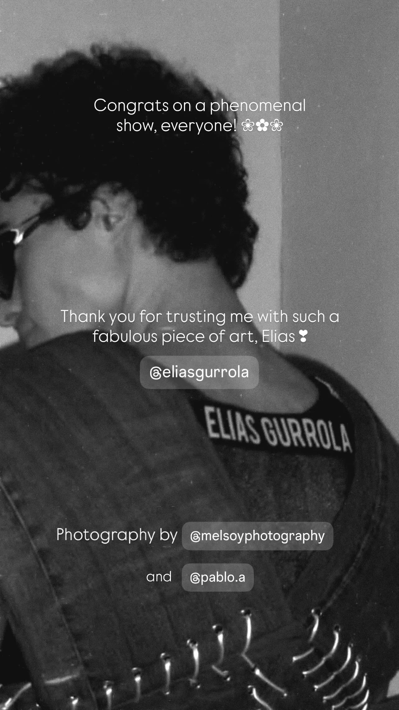 Thank you so much for having me in your show, Elias + team. Your story is truly inspiring and moving, and my heart goes out to you. Thank you for trusting me with such a fabulous piece of art too. As a fashion girlie, seeing the details of each piece up close was such a treat! Thank you again for giving me this experience and a new reality ;)
